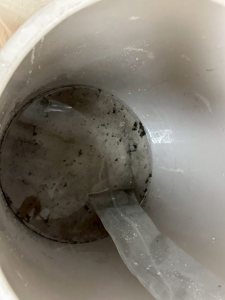 バケツには、カビやホコリを含んだ真っ黒な汚水が溜まります。これが、今までお部屋に循環していた空気の通り道にあった汚れです。