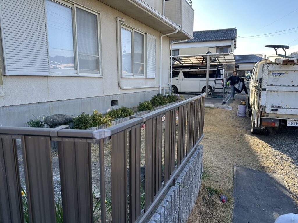 既存カーポートの屋根材(ポリカーボネート)を隣家との目隠しとして再利用したことは本施工の最大の特長です。