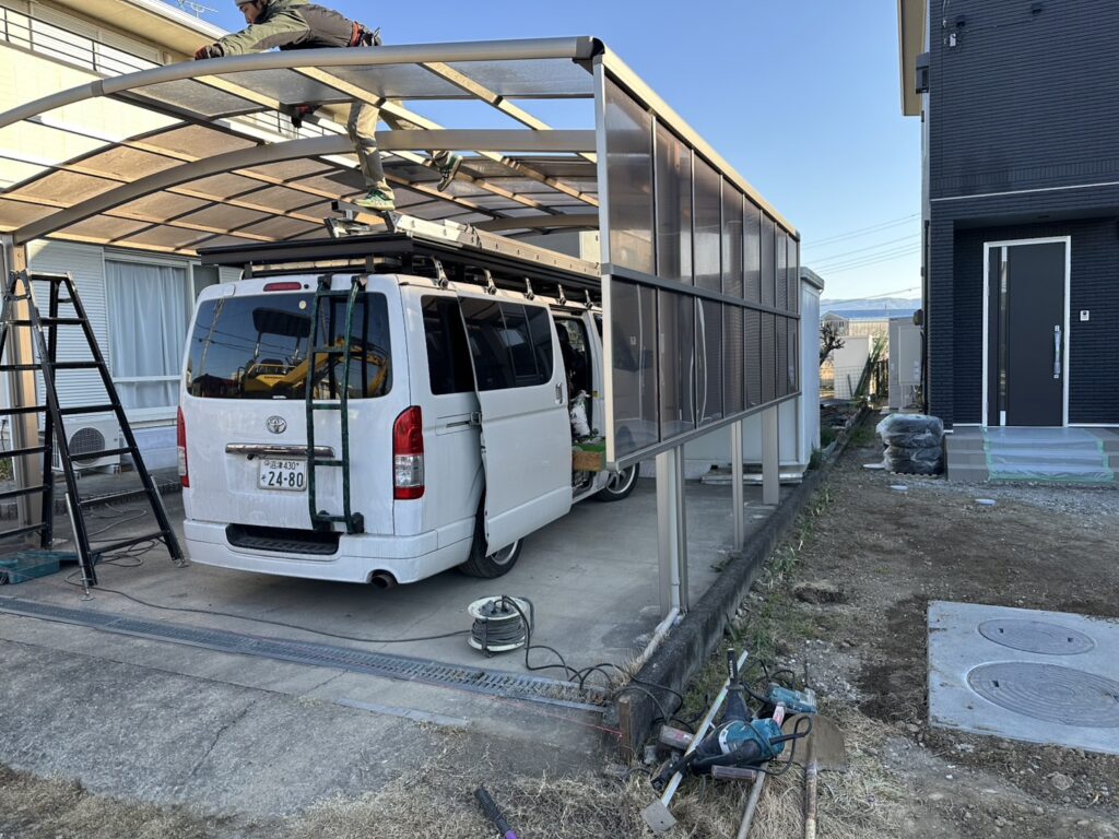 新たな通路や駐車スペースを確保するため、障害となる室外機(エアコン)や水道メーター、地中の雨水配管の移設工事を行いました。管工事を得意とする弊社の強みを活かし、水はけやメンテナンス性を考慮した適切な配管ルートへの変更を実施しています。 - 既存カーポートの撤去および屋根材の再利用(目隠しフェンス化)