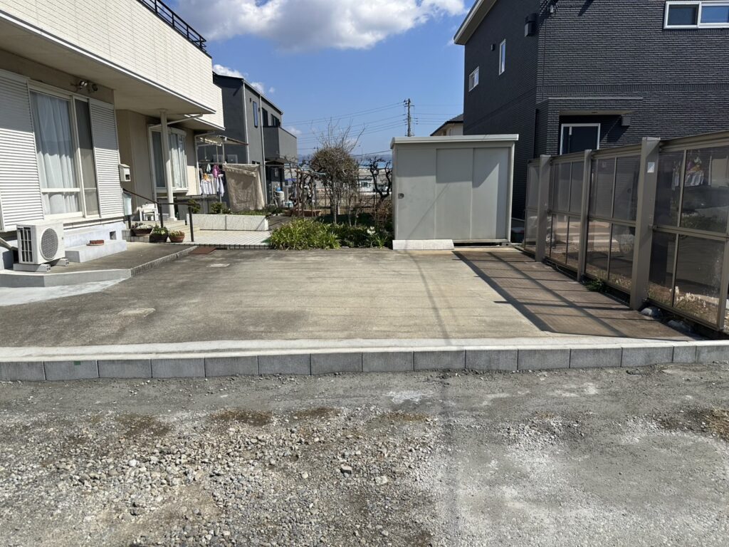 これまで使用されていたカーポートを解体・撤去いたしました。その際、廃棄予定だったポリカーボネート製の屋根材を綺麗に洗浄・加工し、隣家との境界部分の目隠しパネルとして再利用する施工を行いました。 - 隣地境界のブロック積み