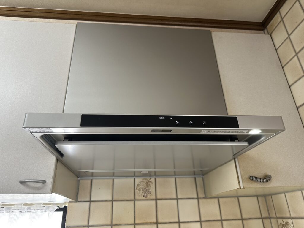 今回の施工では、長年ご使用されていた旧型の換気扇を取り外し、お手入れが簡単でデザイン性にも優れた最新の「スリム型レンジフード」へ交換いたしました。